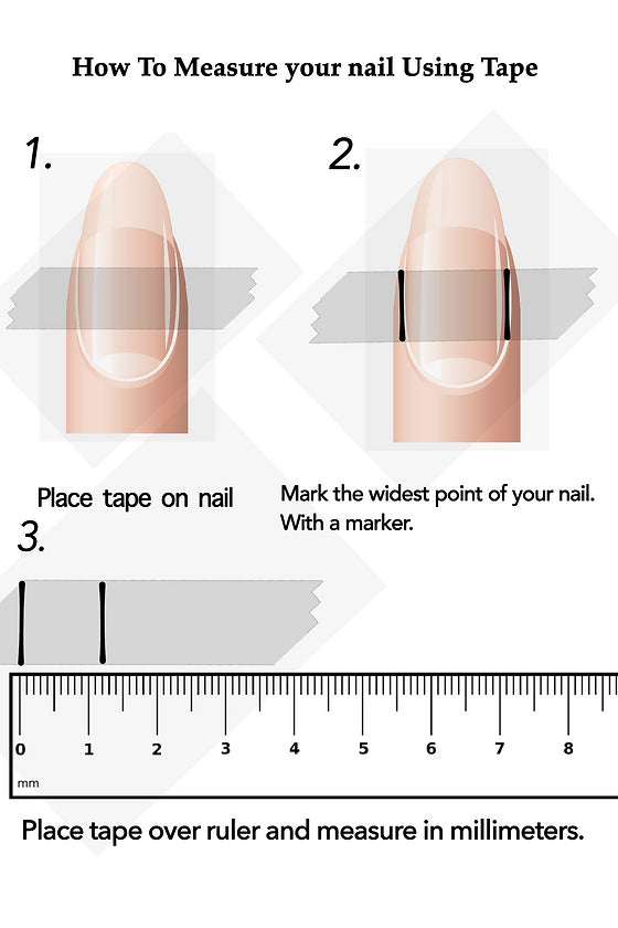 For sizing please refer to image instructions. After your purchase please put together your measurements and DM @insatiablenails on instagram or email insatiablenails@yahoo.com with your measurements, image of your nails from the front to determine fit and order number.
