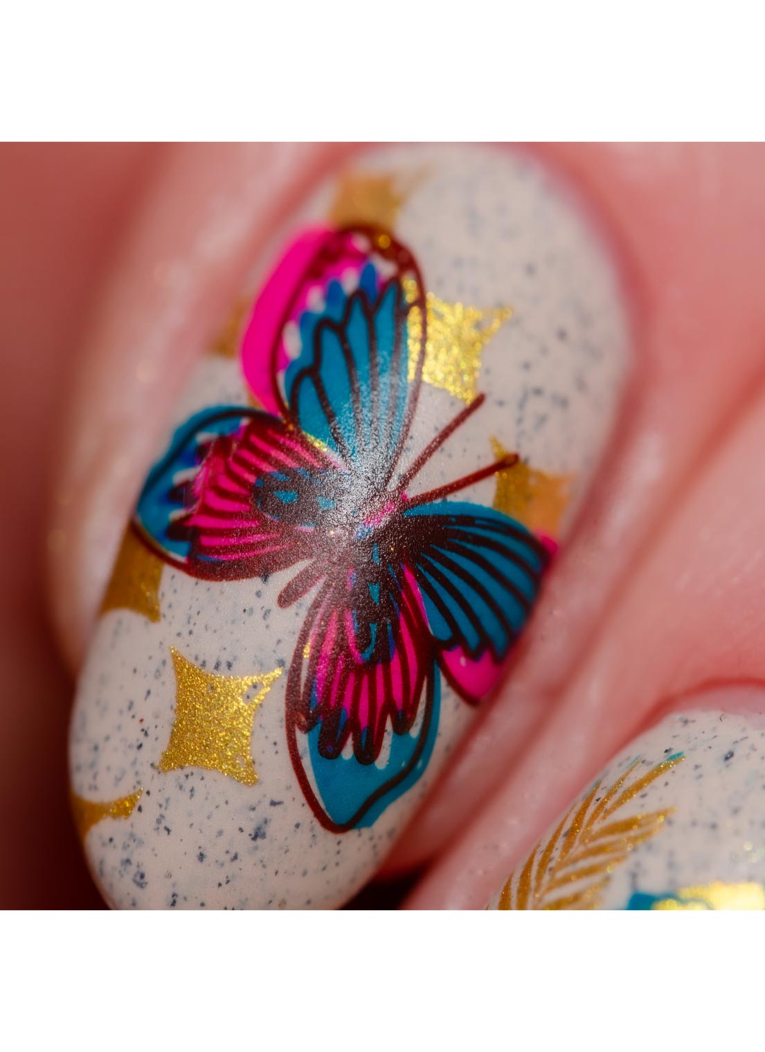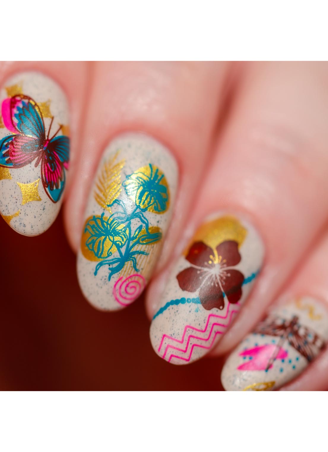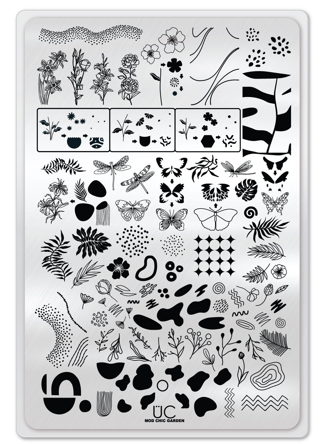 This plate is 9.5 cm by 14.5 cm and has coordinating single images down the center and a few on the sides. Most designs are 17 mm x 21 mm and are built to cover edge-to-edge on even the largest natural nail size. Are small nails left out? Never! Our designs are crafted to not be so overwhelming or large that you can't see what is on your nail - even if it's tiny!